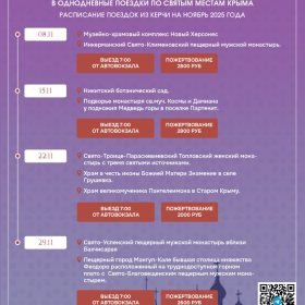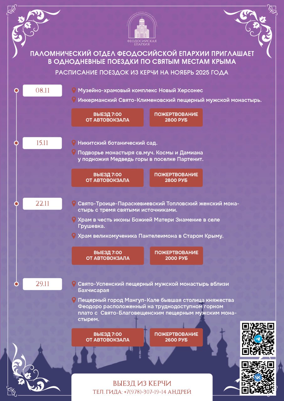 Паломнический отдел Феодосийской епархии приглашает всех желающих принять участие в однодневных паломнических поездках по святым местам Крыма с выездом из Керчи. Это уникальная возможность прикоснуться к духовному наследию нашего края, укрепить веру и получить благословение.